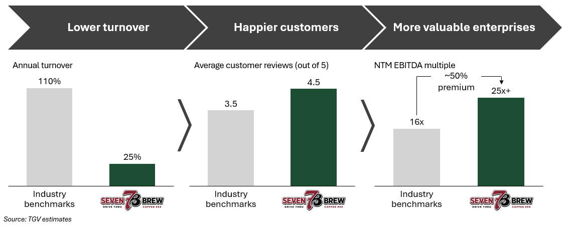 The value of superior labor execution is already visible in leading retailers. In restaurants, 7 Brew Coffee’s materially lower frontline turnover drives industry-leading customer affinity and positions the company as a category leader. That execution advantage compounds - investors value each dollar of earnings at a 50%+ premium relative to peers.